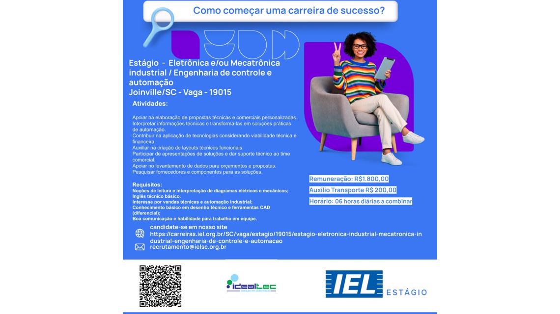 O IEL/SC conecta os melhores profissionais às empresas. Em parceria com a empresa IDEALTEC SOLUCAO EM AUTOMACAO, estamos selecionando um estagiário(a) para atuação na área de Estagio - Eletrônica industrial / Mecatrônica industrial / Engenharia de controle e automação.