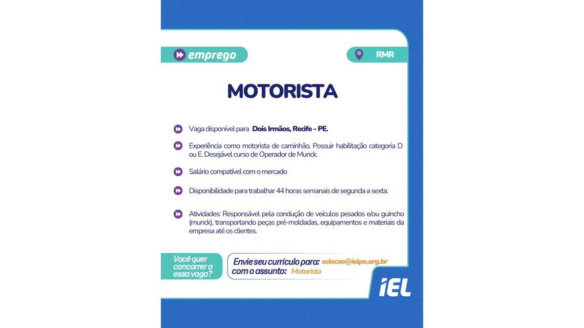 Atividades: Responsável pela condução de veículos pesados e/ou guincho (munck), transportando peças pré-moldadas, equipamentos e materiais da empresa até os clientes.